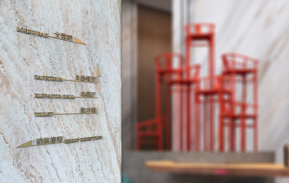在酒店標(biāo)識標(biāo)牌設(shè)計中,“質(zhì)”為“形”和“色”統(tǒng)領(lǐng),但必須考慮材質(zhì)搭配的綜合感觀以及是否與環(huán)境協(xié)調(diào)的因素。仿大理石、紅木、亞克力等板材,在加工工藝上,大多數(shù)文字均以三維雕刻為主,再進(jìn)行烤金、著銀或上其它色漆。